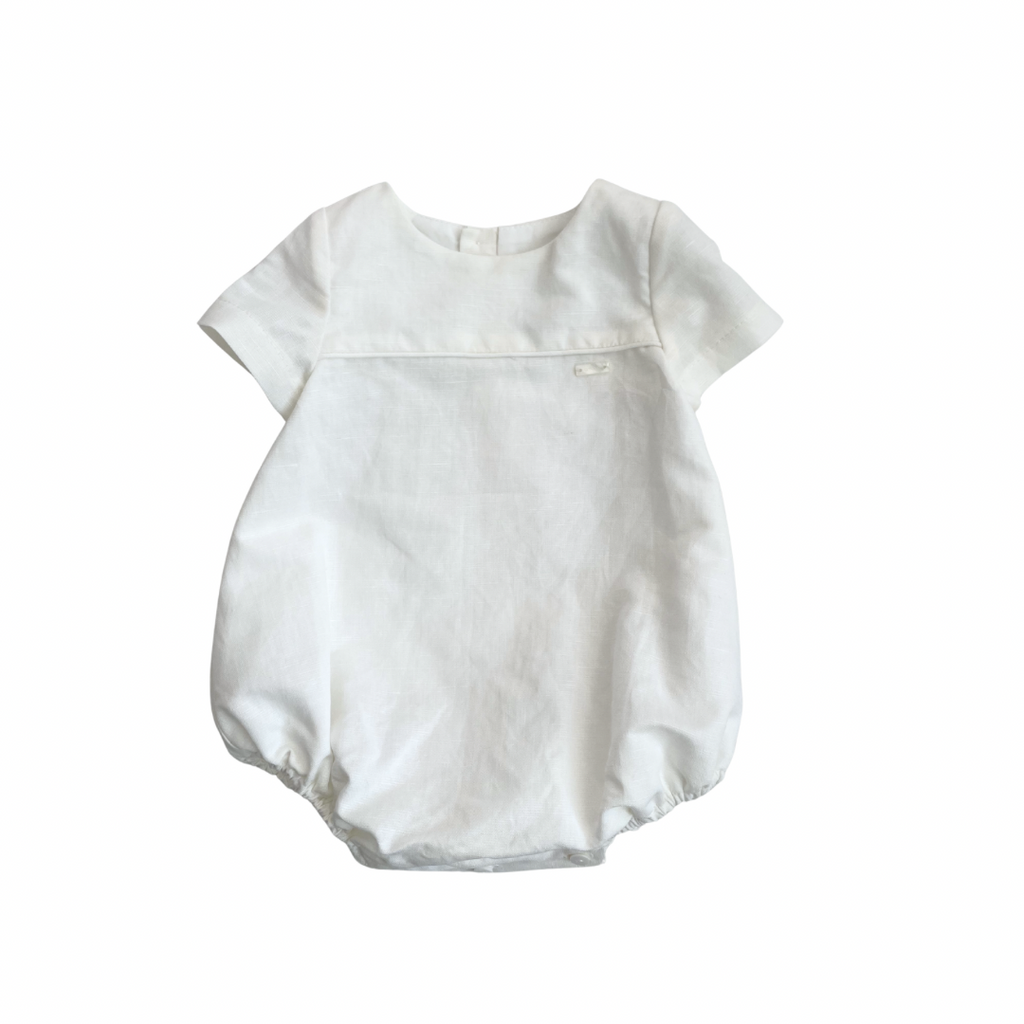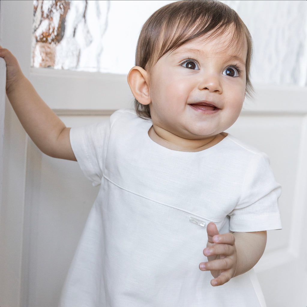 Short sleeve baby romper, in two-tone linen, upper part in ecru and lower part in colours such as blue, make-up, toasted, aqua green or the option of all ecru. Back fastening with mother-of-pearl buttons. Made in Spain. All our garments are made in our Km0 workshops, with an exhaustive quality control. Making garments in the province of Alicante with nearby workshops and in the rest of the Spanish geography, is the scenario of our firm.