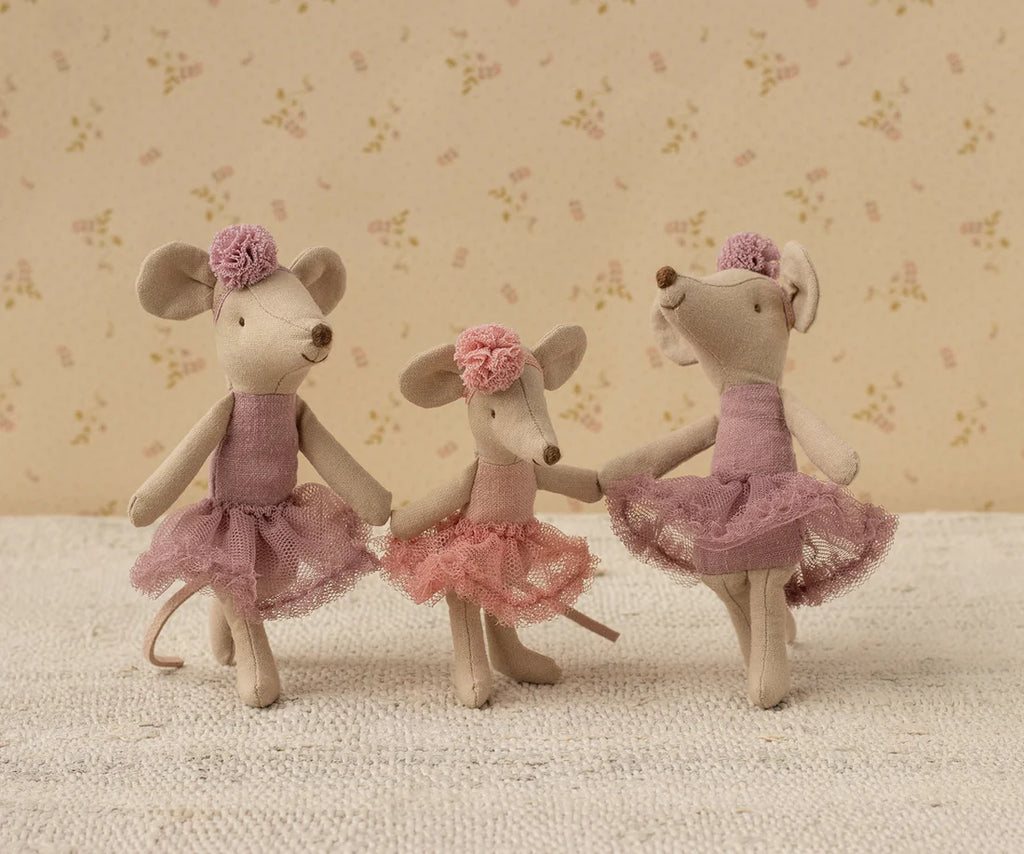 A big sister mouse dressed up like a graceful ballerina. She wears a beautiful heather colored tutu and a beautiful headband - ready for hours of dance.