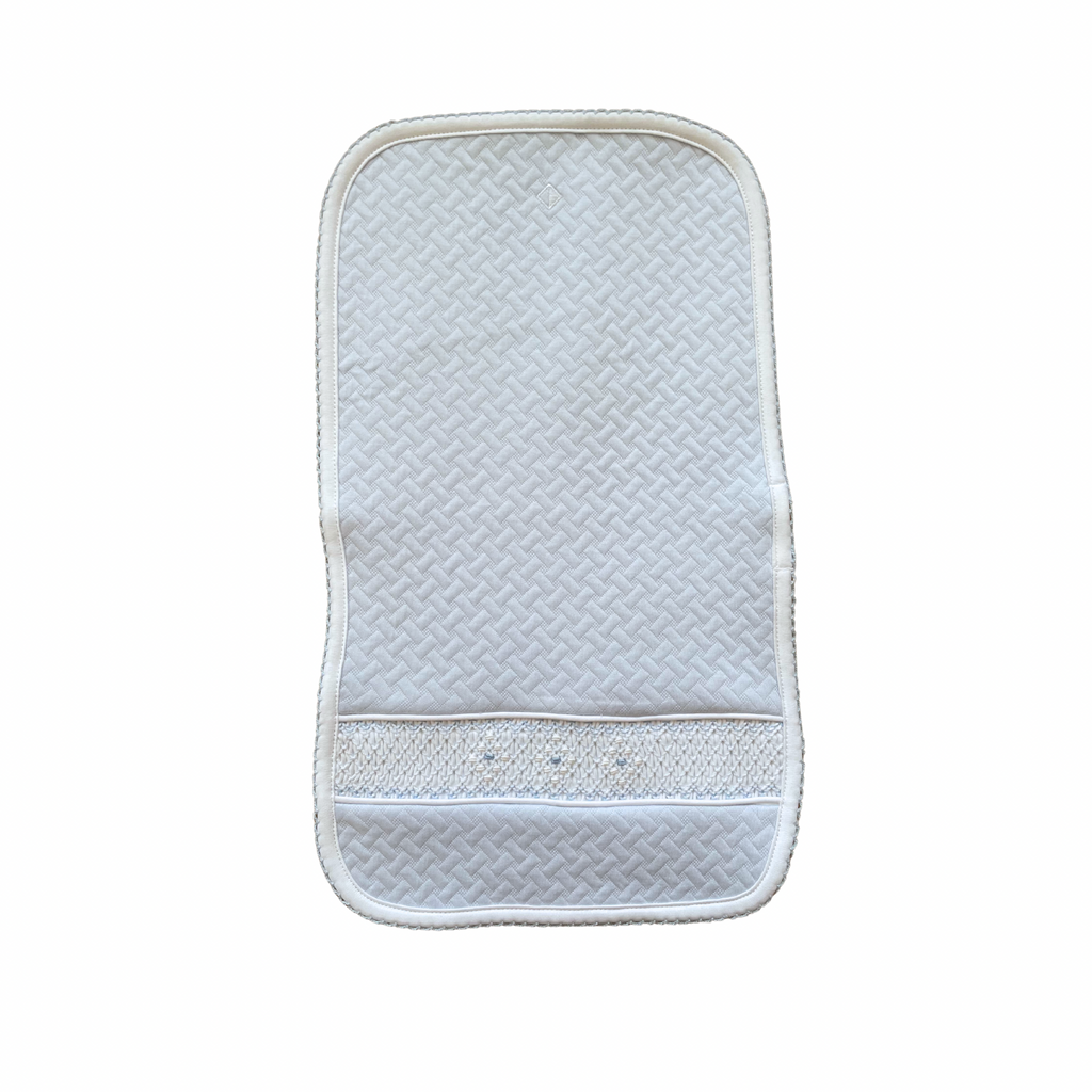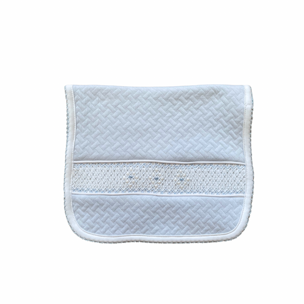 Papalotes 100% ultra soft pima cotton burper pad. Cosy and soft with delicate handsmocked detailing across the front in blue. Made in Peru.