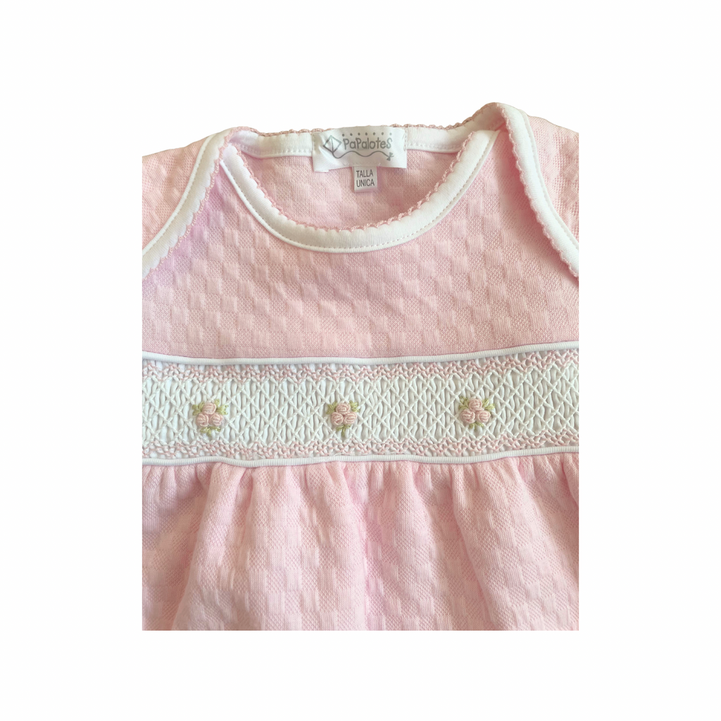 Papalotes 100% ultra soft pima cotton is 25" long. Cosy and soft with delicate handsmocked detailing across the front in pink. Made in Peru.